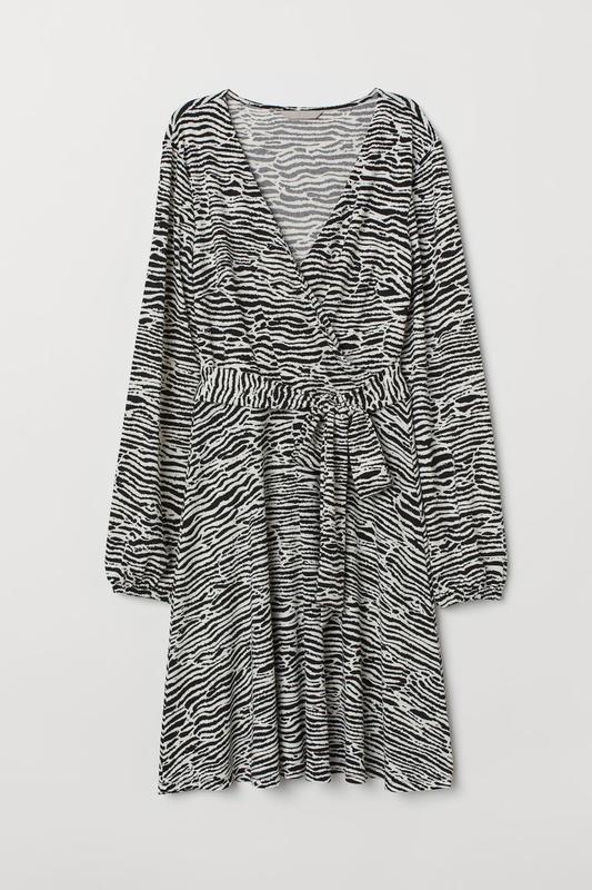Розмір Xs та L Розмір Xs: Довжина 90 см,пог до 47 см,полу талія від 32 см,поб 45 см. Розмір L:довжина 100 см,пог від 52 см,поб 62 см,полу талія 41 см. Сукня з V-подібним вирізом з еластичного трикотажу. Вшита обгортка зверху, шов на талії з поясом на зав’язці та довгі рукави з еластичними манжетами. Частково підкладений.