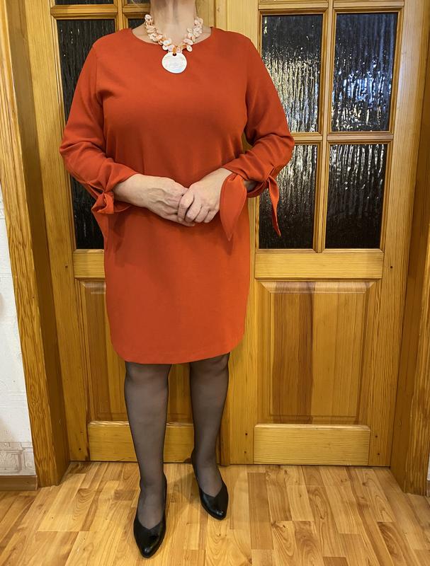 Оранжевое платье прямого силуэта с длинным рукавом. (по спинке имеет вытачки.)Как раз рукав и является изюминкой платья/ на конце рукав имеет завязки, которые вы завяжёте по своему усмотрению. Размер L. Я примеряю на 18 размер. У меня рост 167, то платье чуть выше колена Полуобхват груди 58 см Длина по спинке 90 см Я примеряю с ожерельем, если вас заинтересует - выставку отдельно.