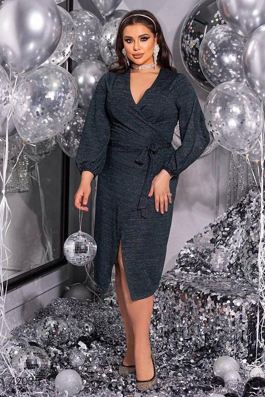 Вечернее платье блестящее на запах Тканина: трикотаж Оригинальные замеры готового изделия: Размеры:50-52; 54-56; 58-60 Обхват груди - 96/104/112 см Обхват талии - 90/98/116 см Обхват стегон - 114/122/130 см Длина рукава- 51 см Длина изделия - 115 см