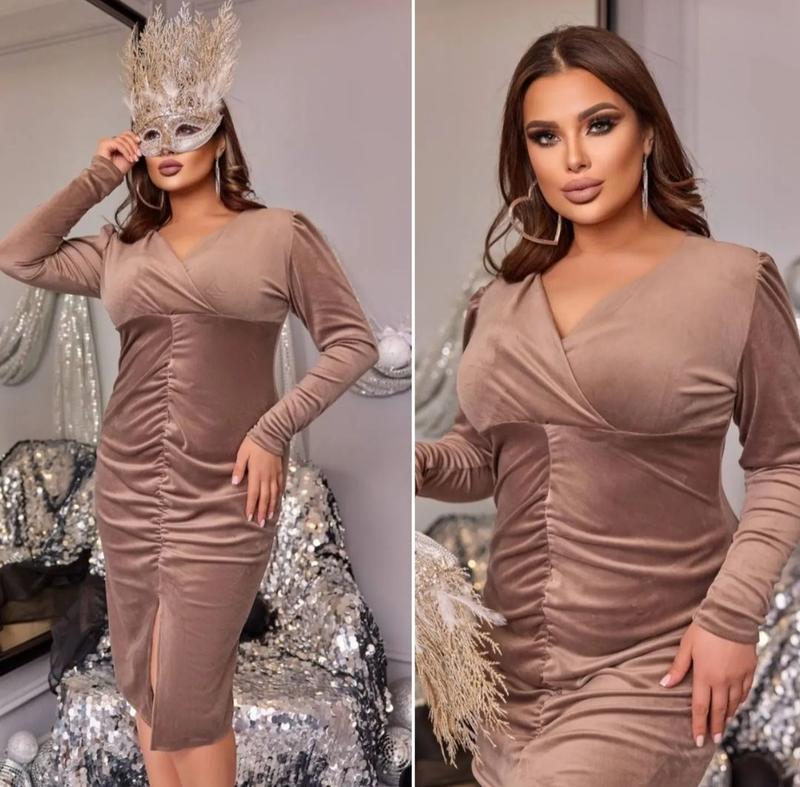 Модель 018VL Ткань: велюр (плотная, приятная к телу, прослужит много лет) Размеры: 42-44, 46-48, 50-52, 54-56 Цвета: черный, бутилка, баклажан, красный, капучино Приталенное платье, спереди «сборка» ткани, по низу разрез; на груди запах; длинный рукав, на плече «сборка» Параметры модели-батал ОГ108, ОТ86, ОБ110, рост 165см, на ней представлен размер 50-52; параметры модели-норма ОГ90, ОТ65, ОБ95, рост 170см, на ней 42-44