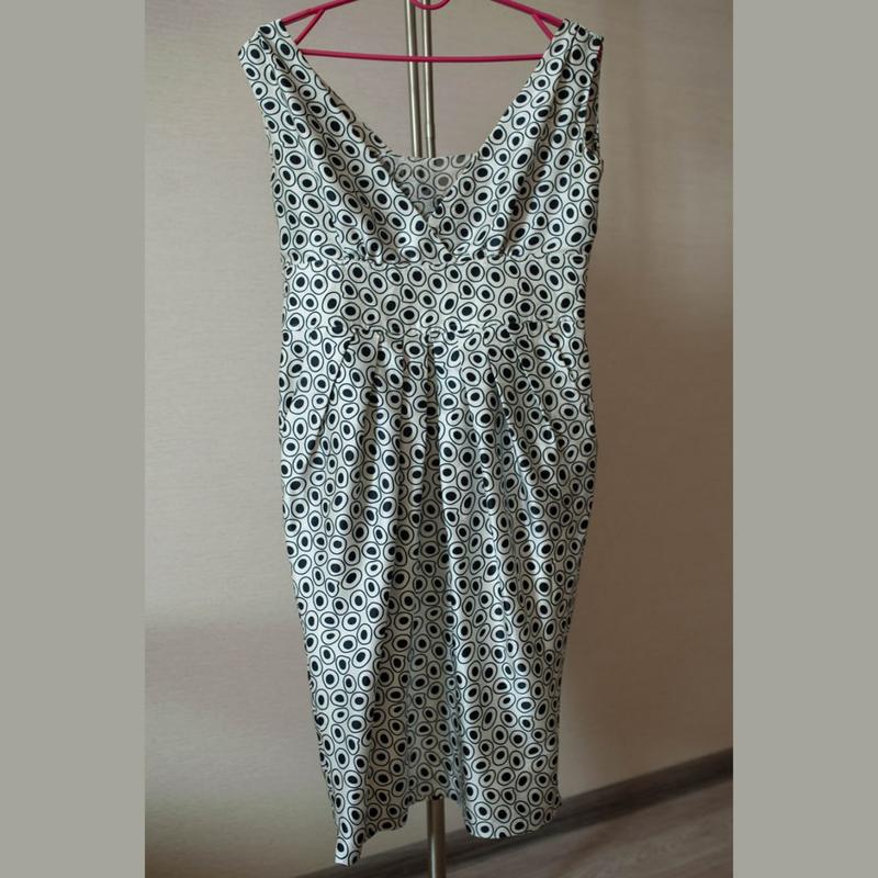 Шелковое платье с геометрическими принтом, довольно интересный крой, бренд-медлмаркет класса, размер указан 48, но по факту 46 НОГ-47(+ виточки, на невелику грудь) НОТ-39 НОБ-50(+ свободные складки) длина -101 см На фото одето на 46 размер, рост 165, садится хорошо Слева сбоку идет молния Состав верха- 100% шелк, состав подкладки-100% ацетат, есть две боковые кошени, если же нижний животик, то складки спереди хорошо маскируют