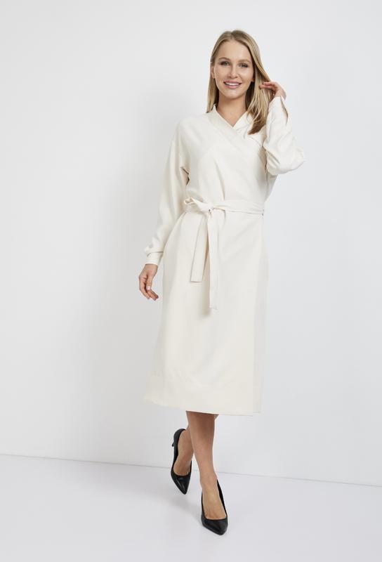 платье прямого кроя - отличный вариант для особых возможностей и даже повседневного образа. Дизайнерский вариант выполнен в универсальном стиле, который можно вписать в минималистичный лук или украсить яркими аксессуарами. Молочное платье имеет длинный рукав на манжете и утонченный запах. Линия талии подчеркивается с помощью удлиненного тканевого пояса. Фасон хорошо сочетается с разными типами обуви и позволяет обладательнице поэкспериментировать со своим стилем.