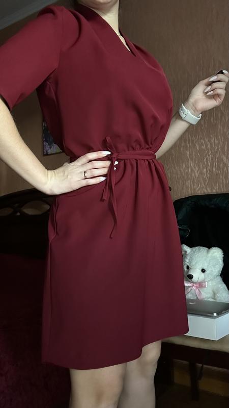 Платье, бордового цвета. Имеет карманы и вшитый пояс, который является универсальным и подойдет на любую талию. Спереди платье идет короче и удлиняется обратно. Длина асимметричная.