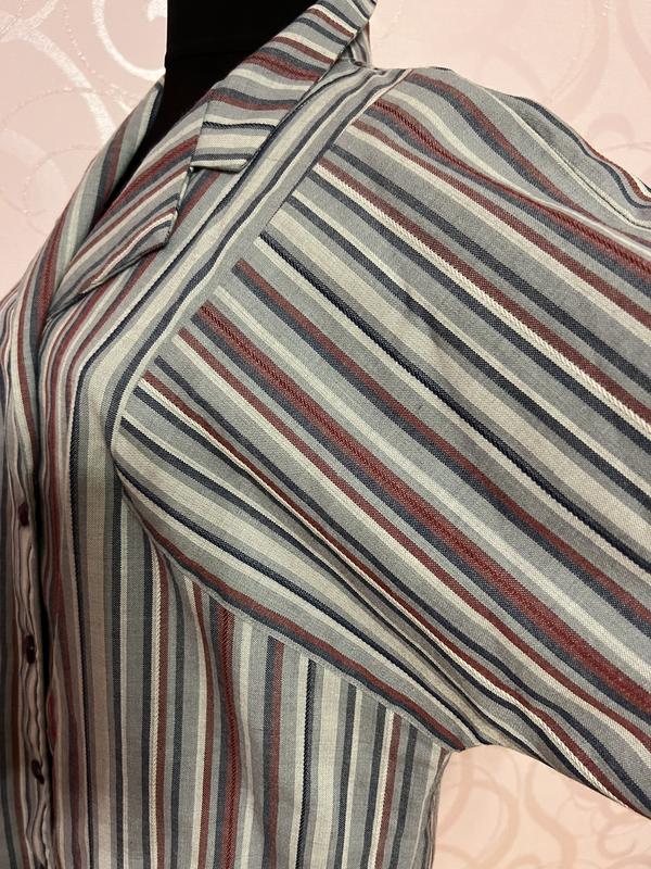 Серое в полоску, глубокие прорезанные карманы, рукав реглан длина от горловины 69; пог 57; пот 55; поб 57; длина 104. 100% вовна