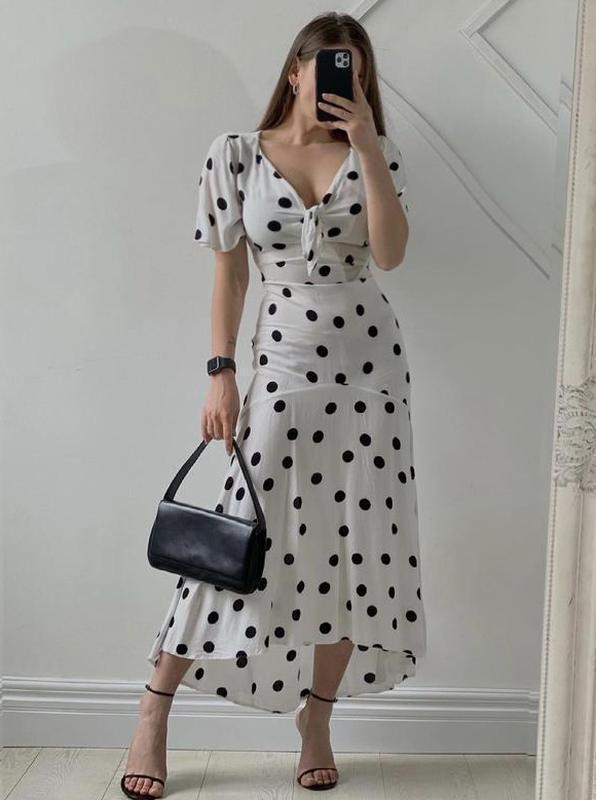 Очень красивое платье из натуральной ткани в горох. Длина миди. Сбоку есть невидимая молния. Размер 36 ПОГ - 47 см ПОТ - 34 см ПОБ - 48 см Длина - 130 см