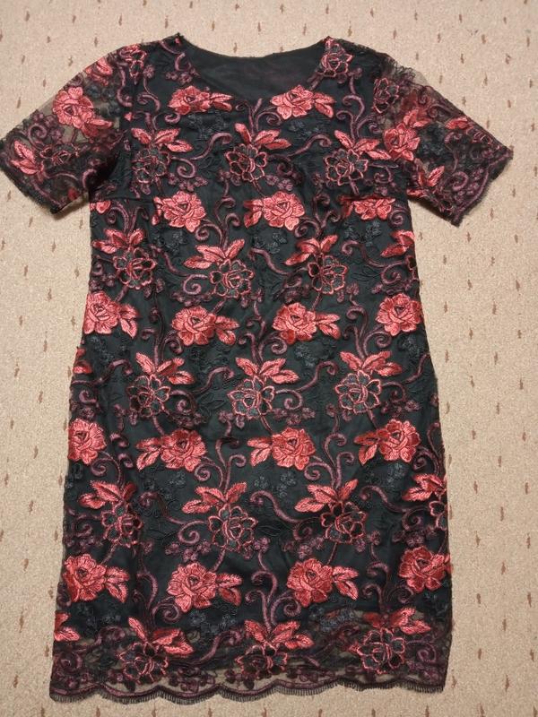 очень красивое праздничное платье. снизу подкладка, сверху кружево с вышивкой. ниточки на цветах красиво переливаются на свету. нова!!! размер 50-52 но ориентируйтесь на замеры длина 100 ог 106-107 от 102-103 об 120 рукав длина 30