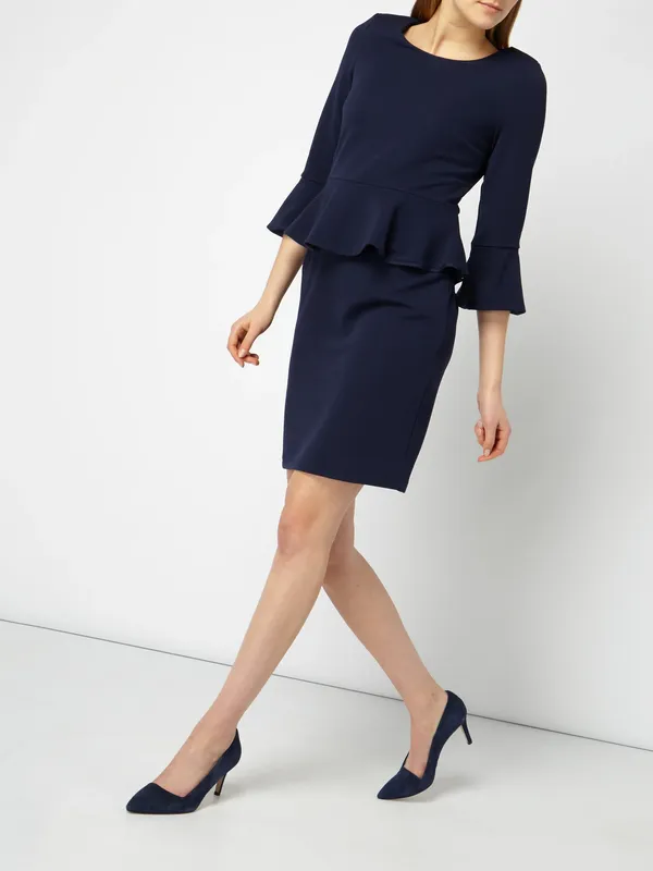Темно синего цвета на подкладке с красивыми рукавами 3/4 От 48, об 55, тянется длина 98