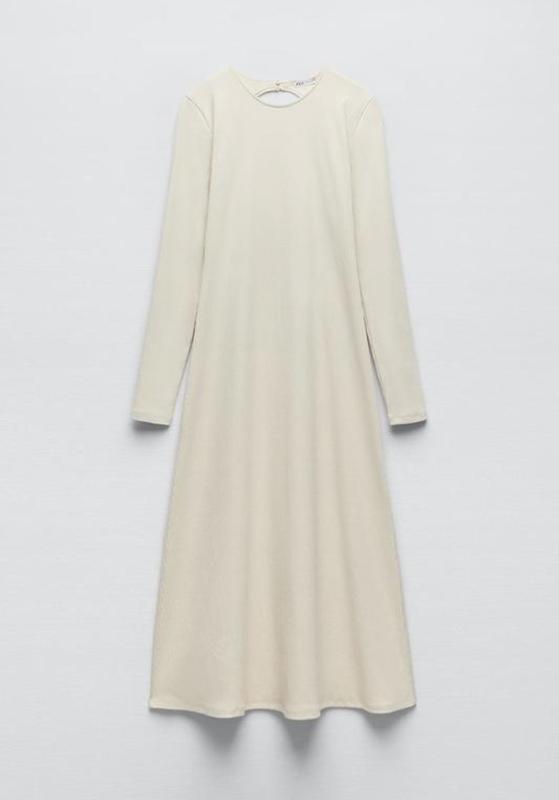 Zara сукня я в рубчик з плотненького трикотажу. на спині виріз, застібка згори на ґудзики S розміри в наявності 95% бавовна 5 % эластан кремовый колір( дуже світлий беж) S по бірці, невелике, сяде в на параметри XS