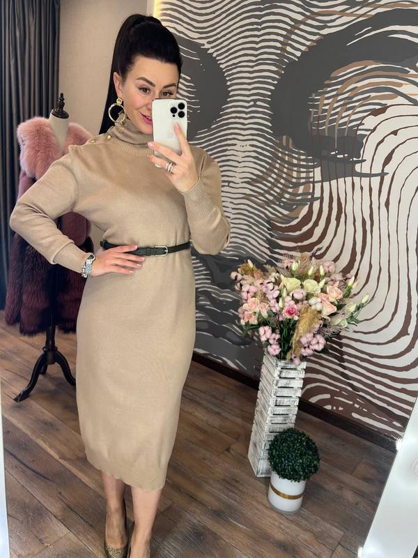 стильна й елегантна сукня вільного крою з високим горлом на гумці внизу і рукавах, у комплекті з практичним поясом, матиме чудовий вигляд на вас у будь-якій життєвій ситуації, вона виготовлена з приємного на дотик трикотажу гладкого машинного в'язання, декорованого яскравими кнопками золотистого кольору на комірі довжина 120-122 см, пг 50-52 см, довжина рукава від шиї 70-72 см розмір 46-50 код 0463