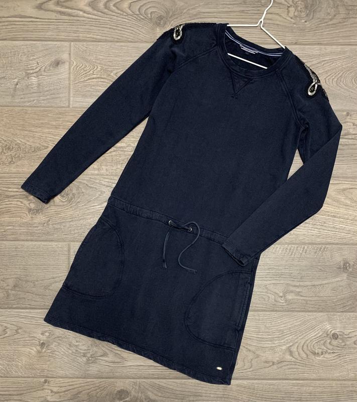 Платье Tommy Hilfiger р. S/36/8 Ткань плотная -двунитка /100% коттон. Есть карманы по бокам, талия - пояс-кулиска, красивый акцент на плечах (вызерунок - пайетки, бисер). ПОГ 50 см ПОТ 48 см ПОБ 54 см Длина 95 см Длина рукава от воротника 76 см