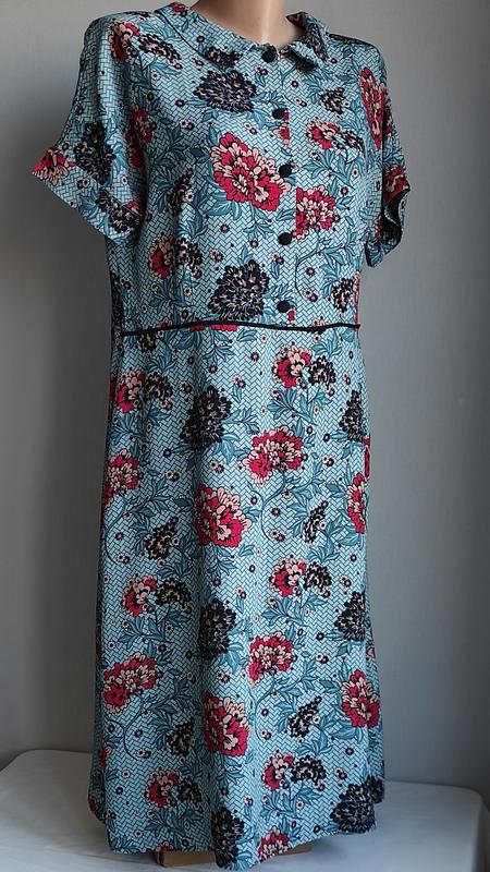Сукня з віскози у квітковий принт. Стан ідеальний. Застібка збоку. Рукав цільнокроєйний, без пройми. Розмір вказано 12/40. Заміри: довжина від коміру по центру спинки - 101 см (38 см + 63 см); ширина в плечах - 76 см; довжина рукава від коміру - 30 см; НОГ - 51 см; НОТ - 46 см; НОС - 57 см; НО низу - 64 см. Додаткові фото та заміри надам за потреби. Дивіться інші мої оголошення.