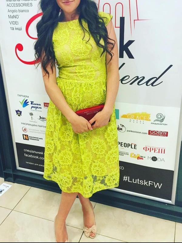 Платье украинского производства бренда Kuma, лимонного цвета, ажурное. Снизу плотная бежевая подкладка. Хорошо прошито и использованы качественные ткани. Есть небольшой дефект сзади снизу от каблука (последнее фото) но его при носке незаметно.
