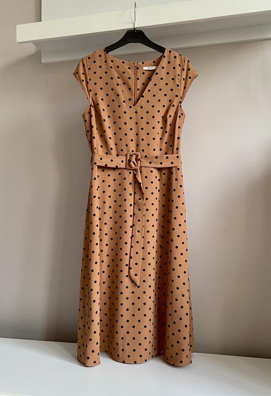 Элегантное платье, колеру корицы в горошек,стильное и Леньте модное, отменного качества и кроя.Замеры смотрите на фото.