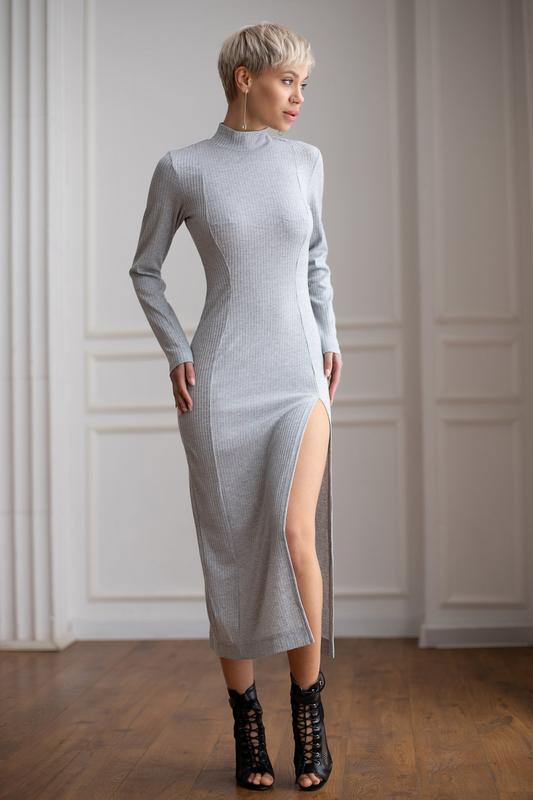 Меди платье в рубчик с высоким разрезом приталенное платье в рубчик