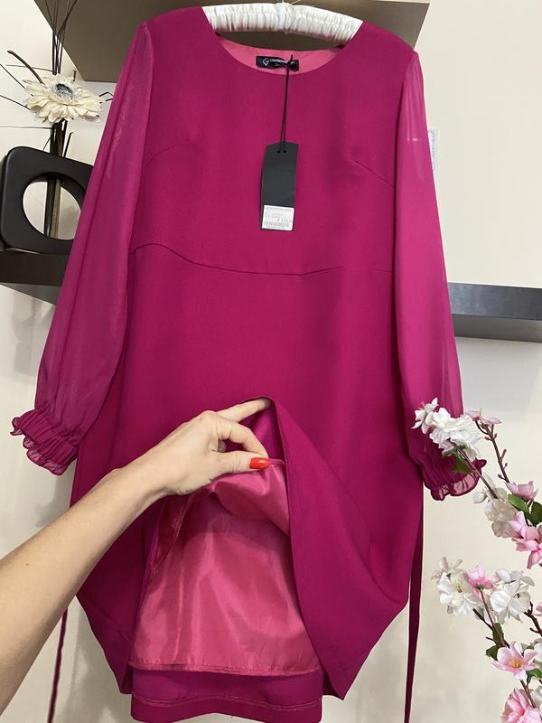 Дорожное, красивое и качественное платье! Размер указан 44 (XXL). Подойдет на XL,XXL Супер-красивый цвет фуксия! Рукава шифоновый с очень красивыми манжетами! На талии по бокам пришиты пояски, которые завязываются! Платье на подкладке! Качественная и очень красивая Ткань! ЗАМІРИ: -длина от плеча - 93 см -ширина под руками - 51 см (полн 102см) -ширина в талії - 52,5 см (полн 105 см) -ширина в стегнах - 57 см (полн 114 см)