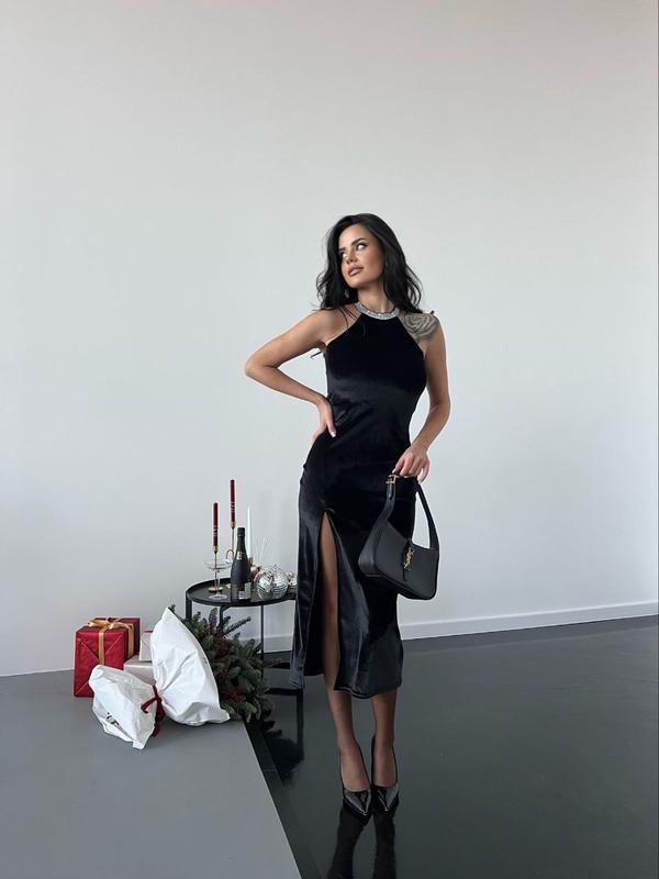 Сукня , в якій ви відчуєте себе зіркою червоної доріжки ❤️ Витончена та елегантна, потрапить не тільки в сердечко , але і в пам'ять тих хто її побачить 🥰 А ще круто що на шиї стрічка із каміння , майже Swarovski, і не потрібно думати ще за аксесуари , так як уже є😍🫶 Модель: #572/63 Тканина: бархат, на горлі стрічка із каміння Розмір: 42-44, 44-46 Кольори : чорний Ціна: 860 грн