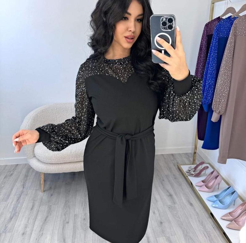 Сукня Цена: 500 грн. КАЧЕСТВО ОТМЕНЕНИЯ Размер : 48-50 Ткань : креп - дайвинг + евро сетка Длина платья : 112 см. Длина рукава : 70 см. ГАРНАЯ РАСТЯЖНОСТЬ. Праздничное платье приталенного покроя, с объемными рукавами на манжете. Пояс из основной ткани идет в комплекте. Ткань приятная на ощупь, высокого качества не кашлатится.