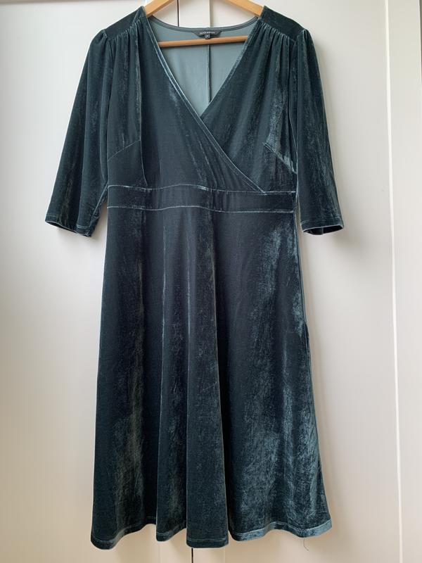 Платье, ткань-велюр, приталенного фасона V образным вырезом. Хорошая розтяжимость ткани. Указанный размер М Замеры: Полуобхват гр 52, полуобхват талии 43-44, бедра свободно. Рукав 3/4, длина 40см. Длина платья 105 см