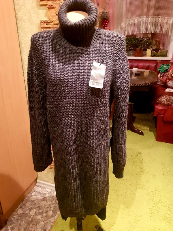 Продам новое шикарное мягкое теплое платье. Очень хорошее качество, вязкая крупная и мягкая фото это не передает. Спереди короче, чем сзади, что позволяет носить высокие сапожки и ботфорты. Длина перед 90, сзади 115, ширина в груди 50 и так к низу. Рукав 65, плечи 44. Все хорошо тянется, идет на 48 и L-XL Качество на высоте. Цвет - темный серый. Кнопку купитьектор не жапать без разговора со мной. Девушки цена без торга, уже сниженная еще сайт возьмет процент по продаже.