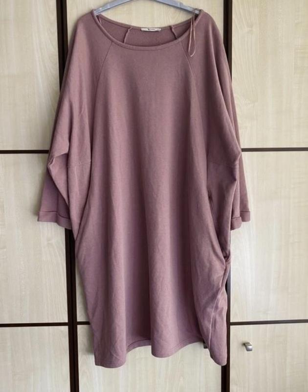 Платье миди и плотного коттона (как свитшот). Длига 98 см, рукав реглан 60 см от горловины до низа. По груди 70, по низу 68 см. Сядет как оверсайз на М или L. Состояние новой вещи