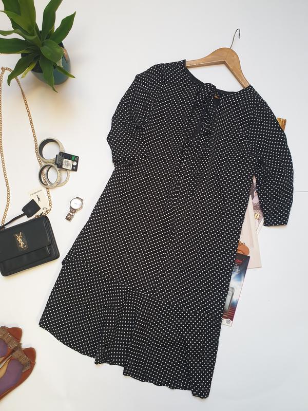 Платье в горох фирмы Makall Польша С зади разрез на спинке. Свободного кроя. Стан идеален. Составляющий: вискоза Имеет подкладку. Размер: М Замеры: длина перод 86 см, длина зад 98 см, рукав 40 см, ПОГ 50 см, ПОТ 56 см, ПОБ 60 см.
