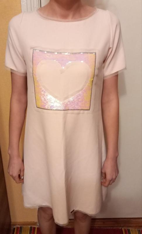 Рожеве плаття la Furia з блискітками у вигляді сердечка `розмір S `наявний дефект на задній частині Довжина - 89 см Півобхват талії - 43 см Довжина плеча - 4 см Довжина рукава - 24 см