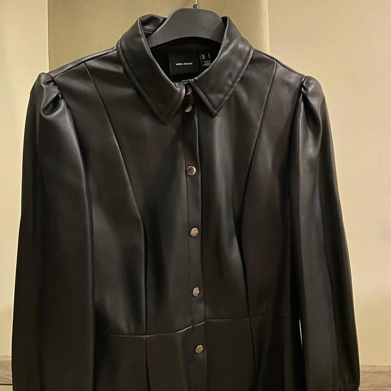 Новое кожаное платье от Vero Moda. Размер – С. Подчеркивает фигуру и вытягивает силуэт. Рукав 3/4. Платье приятное к телу, мягкое изнутри. С радостью отвечу на ваши вопросы и пришлю больше фото по запросу)