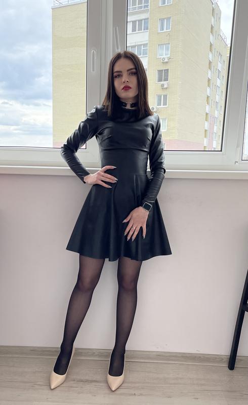 Гарне шкіряне плаття з молнією на спині Об грудей 43см . об талія 33см довжина рукава 46см . довжина 80см