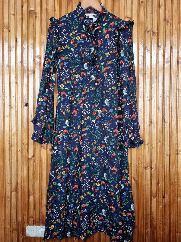 Шикарное платье-миди H&M в цветы, с оборками. Размер в наличии на бирке 36, можно и на 36-38. Новое, бумажная бирка повреждена. Сверху спереди застегивается на пуговицы. Платье очень стильное и красивое, рекомендую! ;) ПОГ 44 см ПОТ 43 см ПОС 53 см Длина 117 см Состав: 100% вискоза Смотрите, пожалуйста, все мое объявления — огромный выбор платьев и блуз H&M, Zara, Mango. ********************************** Подписывайтесь – частое пополнение ассортимента!)