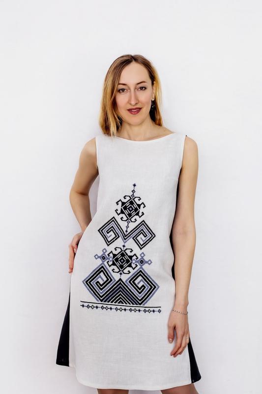 Тканина: білий та чорний льон Техніка виконання: хрестик (ручна вишивка) Сукня трацеподібного крою. На спині розміщене кокетливе V-подібне декольте, спідничка ззаду призбирана. Відчуваючи пильний інтерес до Трипільської культури, ми створили вишиту сукню, на котрій розміщені символи шлюбу стихій Неба і Землі, що були знайдені на глиняних фігурках жінки часів Трипілля. Знаки і символи - архаїчна мова, якою з нами розмовляє Бог. Символи Трипілля - креслення, якими пояснювали світобудову праслов'яни. Безкінечник - символ роду, сім'ї та безперервності, він вказує на нескінченну любов і зв'язок між поколіннями та передачу традицій і цінностей від предків до нащадків. Безкінечник - сакральний меандр циклічності та перемоги Добра над Злом. Сукня розшита вовняними нитками вручну. Перед вишиванням ми обов'язково обробляємо нитку, що додає ниткам стійкості і з часом вони не втрачатимуть кольору. Також вовна створює візуально цікавий ефект об'ємності візерунку. Варто зазначити що вишивка вовняною ниткою є традиційною для Західного Поділля. А згідно з однією із версій домінування чорних кольорів у вишивці було зумовлене тим, що тут розводили особливу породу чорних овець, з руна яких робили нитки. Розмір на Марічці - М, її зріст - 178 см Якщо на складі не виявиться потрібного розміру, ми виконаємо Ваше замовлення в найкоротші терміни.