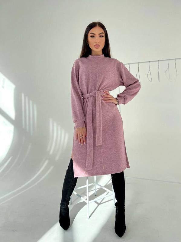 🔥🔥🔥теплое платье из ангоры с поясом/ платье с рукавами/теплое платье с разрезами/пудров...