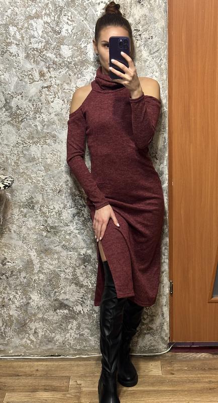 Теплое платье Длина меди Открытые плечи и высокий воротник По бокам разрезы Размер С-М Нова В связи с закрытием магазина продаются остатки товара, поэтому бирки на некоторых товарах отсутствуют