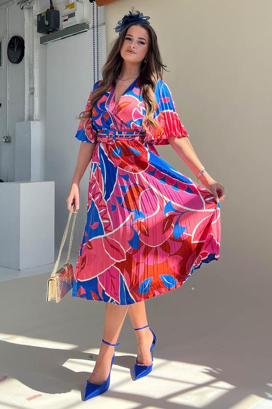 Платье миди плиссированное с запахом по вырезу и изящными плиссированными рукавами,пояс с пряжкой создаёт идеальный силуэт.Потайная застёжка- молния сбоку обеспечивает удобство надевания.Платье, выполненное в эффектном абстрактном принте с потрясающими кобальтовыми и розовыми бликами,сочетается с туфлями на каблуке и кроссовками. Довжина 40+78 НО ( напів обхват) грудей 50-51 НО талії 41 НО стегон приблизно 63 рукав 31 плечі 38