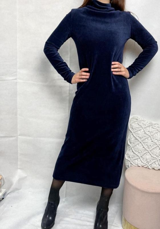 сукня тепла велюрова воротничок гольфик стильная,современная супер качество Синя вельветова сукня бенетон Размер хс Плечи 38 Пг 44, тянется до 50 Талия 40 Стегна 45 Длина 116 Рукав 61 73 котон 25 полиэстер 2 еластан
