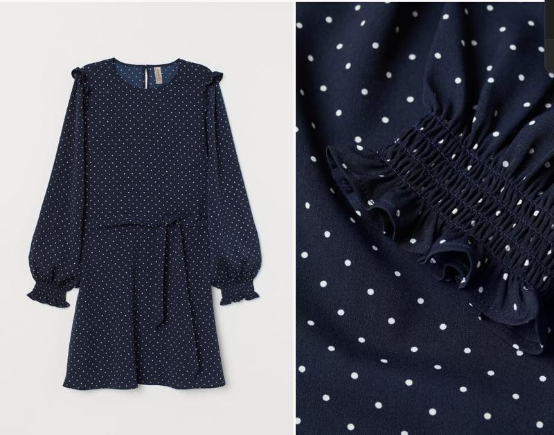 Платье H&M Размер М Короткое платье из узорчатой ткани с короткими воланами на каждом плече, длинными широкими рукавами со сборками и небольшой оборкой на манжетах. Небольшой разрез на пуговице сзади на шее, потайная молния с одной стороны, отрезной пояс на эластичной талии сзади и съемный пояс. Без подкладки.