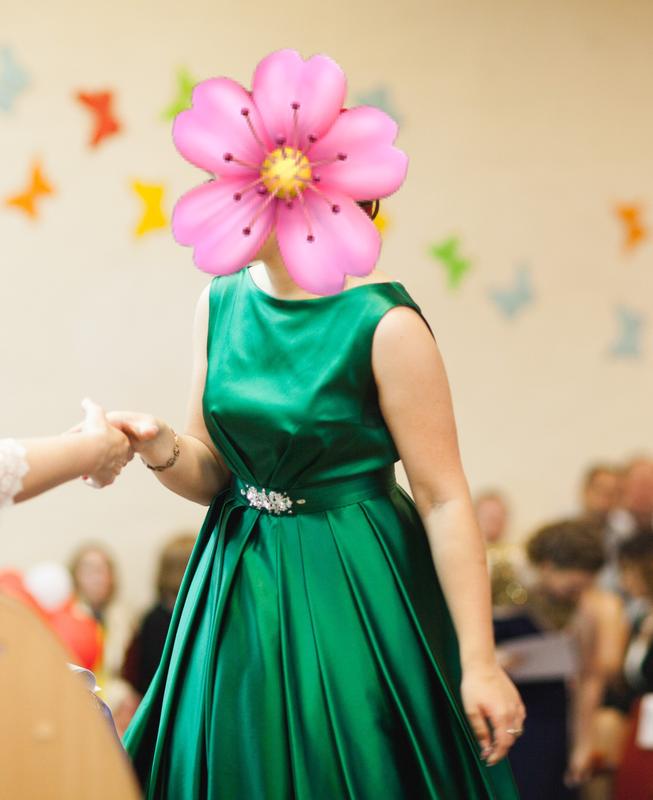 Французский атлас. Сукня шилась під замовлення по індивідуальному дизайну в салоні Анни Челишкіної. Є під'юпник - тоді сукня пишна, як на перших двох фото. Можна вдягати і без нього, теж виглядає досить елегантно. Пояс та спинка прикрашені камінцями Swarovski. Вдягалось один раз-на випуск. ОГ - 75 см ОТ - 70 см Довжина - 110 см {мені до середини литки} Колір в житті трошки темніший, насичений та глубокий ізумруд.