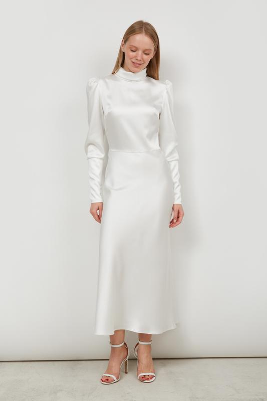 Стан - идеальный Раз одягала Размер С Платье миди прилегающего силуэта из сатина молочного цвета. Имеет длинные пышные рукава со сборками по глазу и отрезной частью по линии локтя. Снизу на рукавах располагаются утяжеленные пуговицы и навесные петли. Платье имеет воротник-стойку с отворотом и разрезом сзади. Также, сзади на воротнике расположены утяжеленные пуговицы и навесные петли. Платье с отрезной талией и расширенной к низу юбкой. По переду лиф с нагрудными вытачками, по спинке на лифе вертикальные талиевые вытачки. Потайная застежка в боковом шве платья.