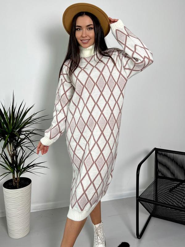 🧵В'язанавовняна сукня. Модель із високою горловиною. Рукави зі спущеною лінією плечового шва та манжетами. Виріб дрібної в'язки з ромбоподібним візерунком. Низ виконаний резинкою. ✔Розмір універсальний:42-50⤵️ ▪️Об'єм грудей:106-122 ▪️довжина по спинці - 115 см ▪️довжина рукава (від горловини) - 74-76 см. 🧵Склад: 70% вовна, 30% акрил 🧵Матеріал: Вовна з акрилом 🎨Колір: молочний 💳Вартість:1490грн Арт901104 ‼️Кількість обмежена ‼️