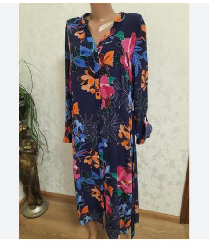 Шикарное платье-рубашка макси яркий цветочный принт на темно-синем фоне пояс карманы длинный рукав (трансформируется) великолепного качества комфортно в носке состояние новой вещи ПОГ 50 ПЛЕЧИ 40,5 РУК 62 БЕДРА 54-55 ДЛИНА 120