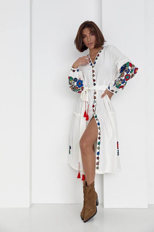 Платье вышиванка, белое женское вышитое платье на пуговицах, платье рубашка вышитое