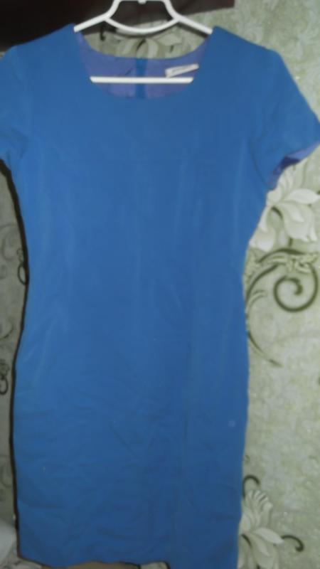 Сукня з щільного матеріалу синього кольору. Плече 9-9,5 см, рукав 15 см, грудей 44-46 см, по талиии 35-37 см, по стегнах 45-48 см, по спинці 35-37 см, по талії 35-37 см, довжина 90 див.