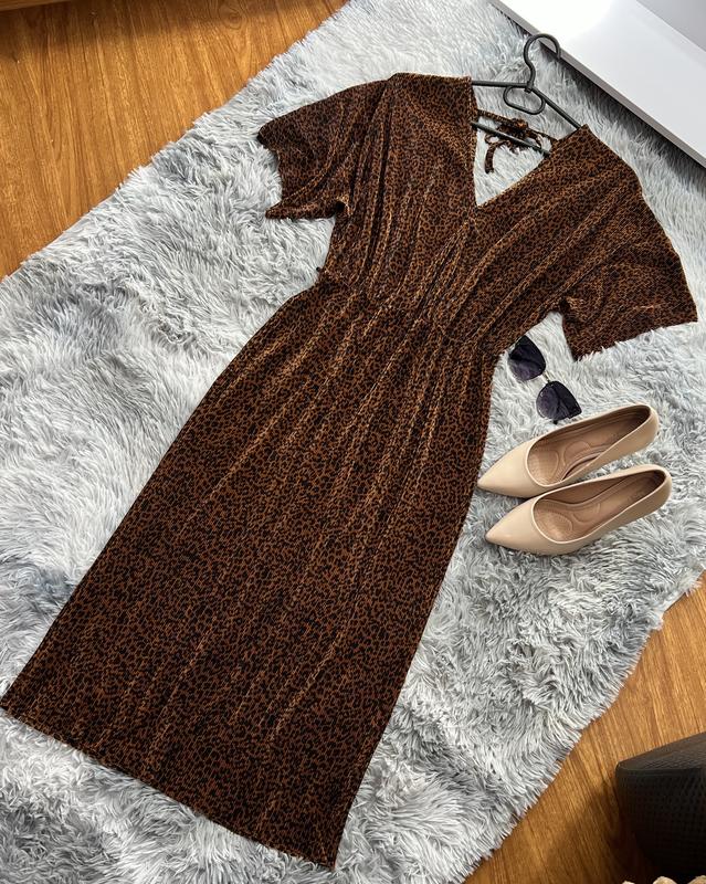 Елегантна, довжиною міді сукня з Леопардовим принтом бренду River Island В платті Чудова і приємна до тіла Струменева і досить еластична тканина. Леопардовий принт, ідеальний колір на осінь чи на будь яку іншу пору року, Середній розкльошений дизайн. З V-подібним вирізом спереду і заді, плюс ще має завʼязки на спині . Напів рукави кажан Є маленькі петельки для поясу на талії, ледь помітні. В ідеальному стані без дефектів. Підійде на розмір М-Л Якщо потрібно зроблю заміри)