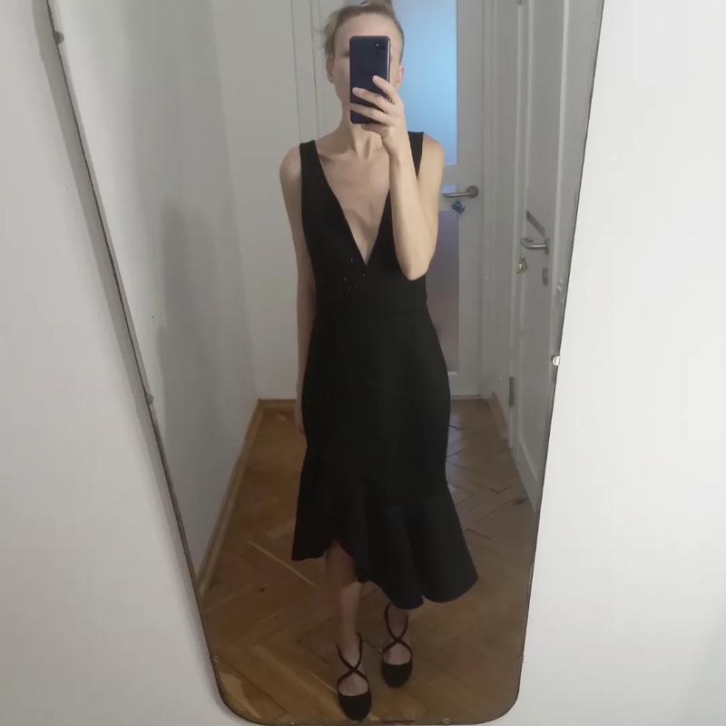 маленькое черное платье из неопрена, очень плотное, держит форму, на вырезе на груди имеет косточки, замочек сзади, в отличном состоянии.