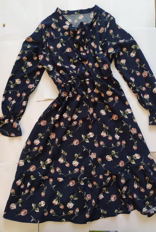 Размер XS, S. На худи девушка. Платье темносинего цвета с цветами. На шее связывается. Рукава и пояс на резинке. Есть небольшой дефект (есть на фото) но он совсем не заметен. Длина сверху до низа 95 см рукав от плеча 54 см ПОТ 29 см за счет резинки