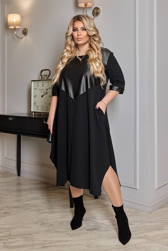 Платье. Модель : 850/1525 Цена: 1200грн Ткань: креп дайвинг + эко -кожа Турция. Размеры: 50-52, 54-56, 58-60, 62-64. Цвет: шоколад, черный и капучино. Комбинированное женское платье,выполнено из креп дайвинга и эко-кожи. Модель свободного кроя позволит скрыть лишние сантиметры талии и выглядеть современно. Длина миди. Вырез округлый, верхняя передняя полочка из эко-кожи. Рукав 3/4.Подол асимметричный с красивыми вырезами . В боковых швах карманы. Длина платья 115 см. Платье станет любимым нарядом для девушек , который стремятся покупать удобные и одновременно стильные в