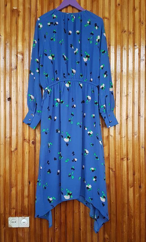Стильное платье-миди H&M с асимметричным низом. Размер по набору 36. Округлый вырез горловины спереди застегивается на пуговицу. Талия на резинке + затягивается шнурками. Манжеты на рукавах на двух металлических пуговицах. На подкладке. ПОГ 47 см ПОТ 37 см, тянется ПОС 54 см Длина 102/115 через крой замеры +-, платье идет в размер. Смотрите, пожалуйста, все мое объявления — очень большой выбор платьев и блуз H&M! Подписывайтесь на свои обновления - ежедневно пополнение ассортимента! Состав: Верх 100% полиэстер/подкладка 100% полиэстер