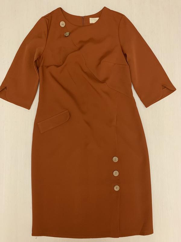 Елегантна сукня з декоративними елементами. По спинці на потайній блискавці Колір- теракотовий Карман-не робочий Тканина не тягнеться В наявності-52 Фактичні заміри ОГ-100/102 ОТ-94 ОС-110 Довжина сукні-105 Довжина рукава від плеча- 43 Обхват рукава-35 Довжина блискавці по спинці-40 см