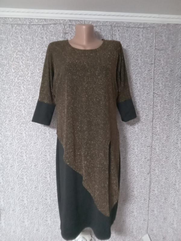 состояние новой вещи,бумаж.этикетки нет,основой платья черный трикотаж со штуч.нитками, не скручивается, не мнется,гарного качества...верх из люрекса золотого цвета,можно носить по разному...очень хорошо тянется, подейдет на размер больше пог 51 см + тянется пот 47 см + поб 55 см рукав от шеи 50 см, возвышается подбить доверху длина 103 см