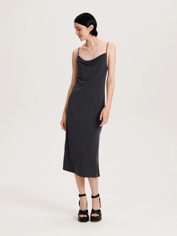Вдягалось один раз. Платье приталенного кроя, выполненное из гладкого трикотажа с модалью, эффектные сборки спереди, узкие регулируемые бретели, длина миди. Размер Xs-S-M