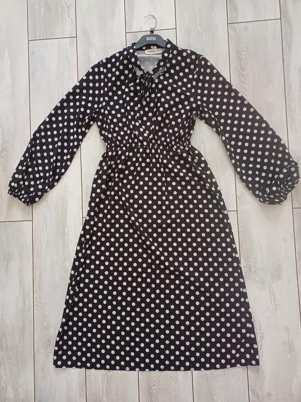 красивое платье в горошек с бантом. Замеры: [ ] Плечи 40 см [ ] Рукав 61 см ( внизу резинка) [ ] ПОГ 49 см [ ] ПОТ тянеться резинка до 50 см [ ] Длина 118 см